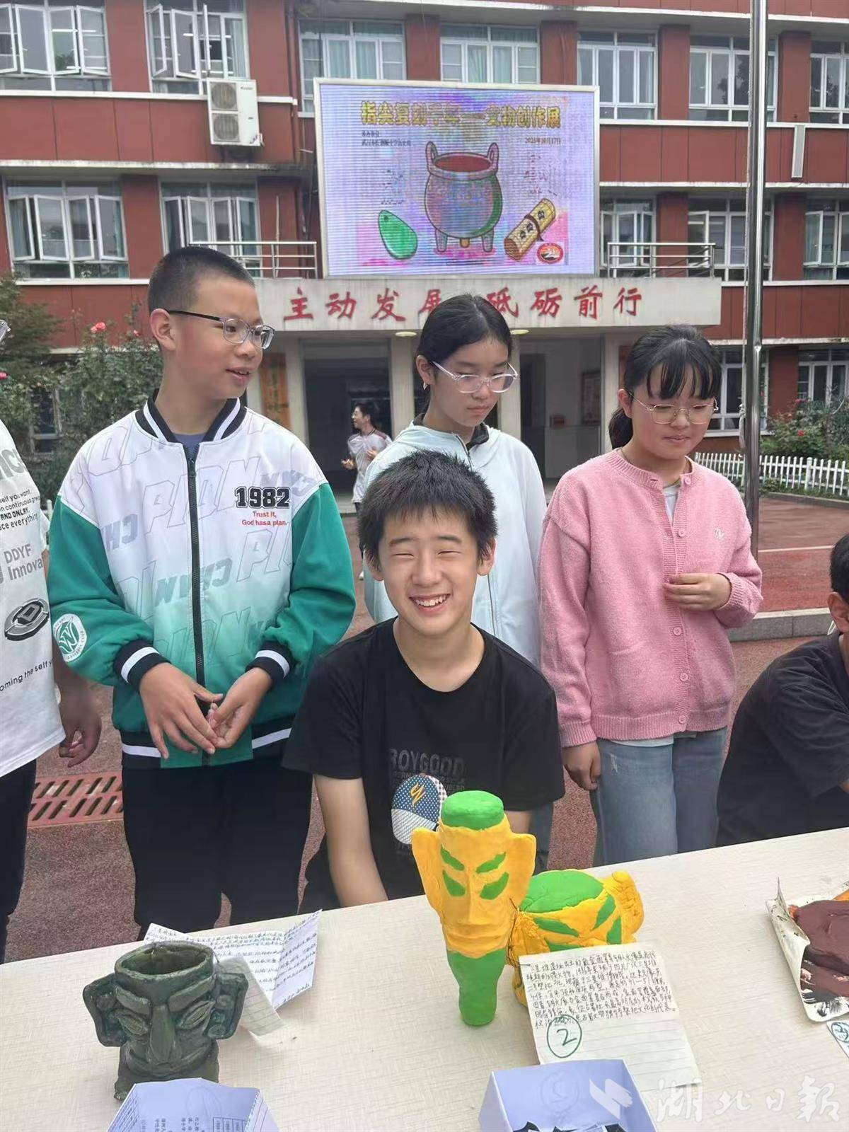 这些由日常材料创作的作品,不仅形似更求神似,在复刻文物形制的同时,更注入少年对历史文化的理解。其中,三星堆面具作品双眼突出、嘴角微扬,既有文物的神秘感,又带着学生手工的鲜活感,吸引不少师生驻足聆听讲解。